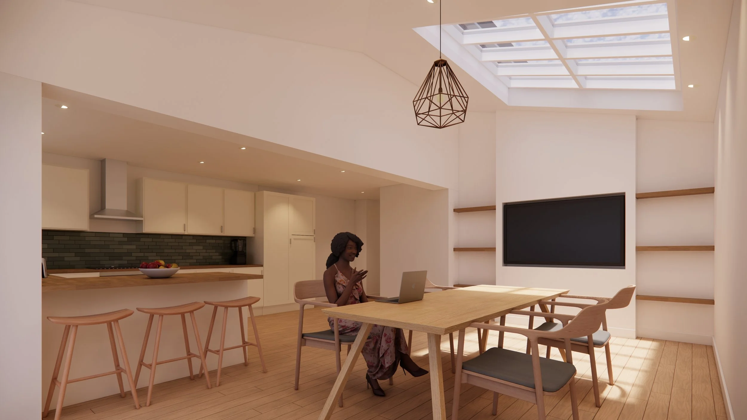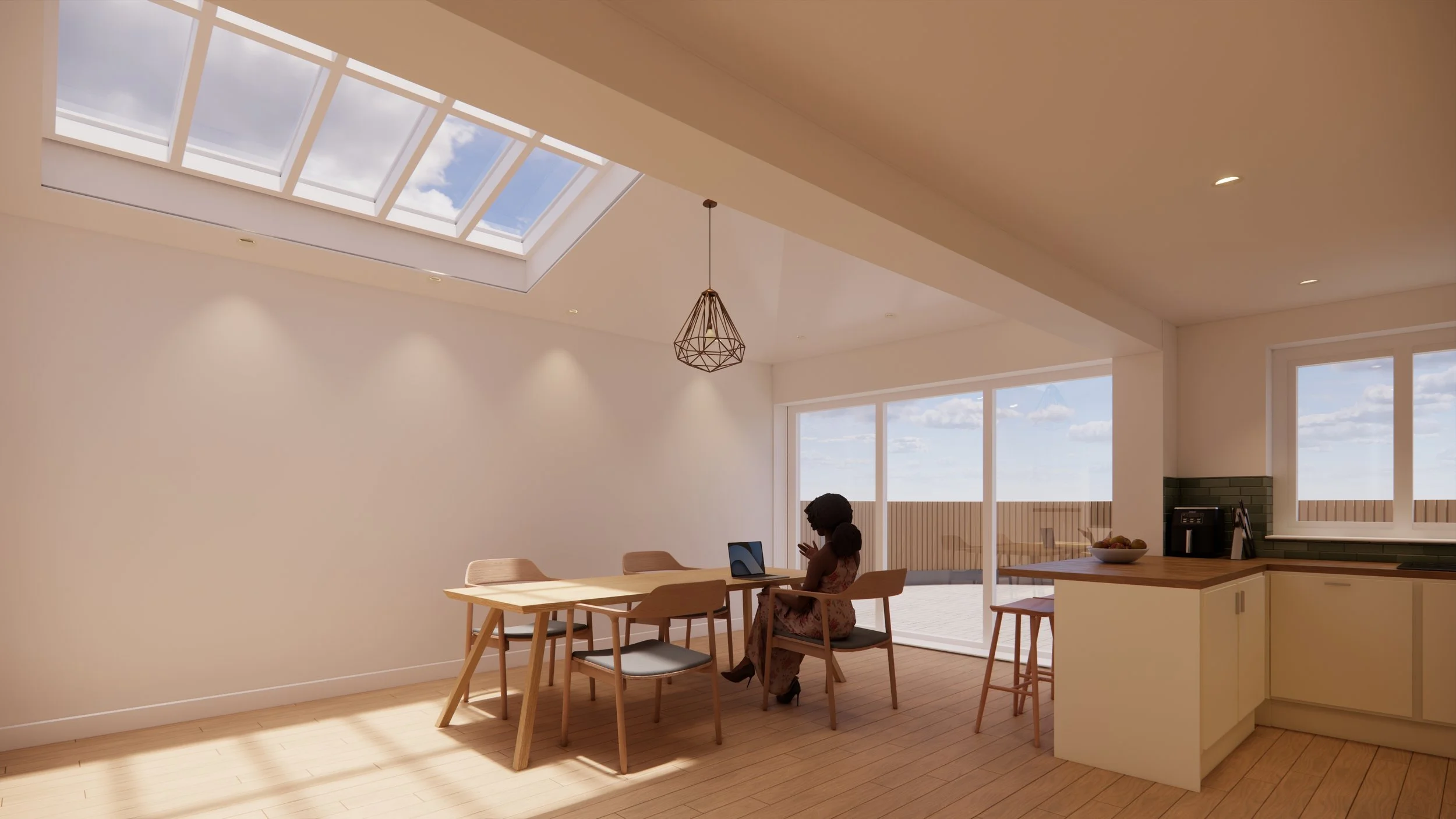 A key architectural feature of the extension is the large glazed rooflight positioned above the kitchen area. This element draws natural daylight deep into the heart of the space, creating a bright focal point throughout the day while enhancing the sense of openness and volume. Full-height glazing and wide openings to the garden further strengthen the indoor-outdoor relationship and flood the interior with light.